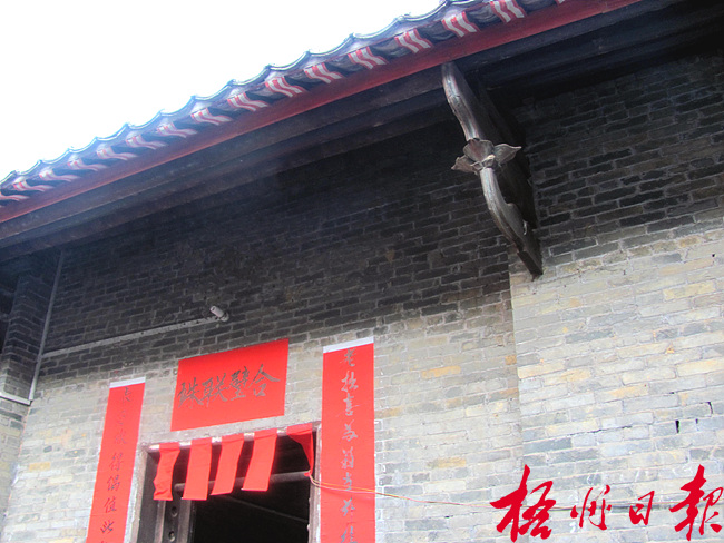 ????莫乃群故居是由一院、兩進三間開、一天井、兩廂房構成。院子里面的房子皆為磚瓦兩層結構,明顯比一般的兩層屋子高。莫乃群故居簡潔、靜穆,頗有番深宅大院的味道。走廊鋪設著青磚,天井是鵝卵石鋪成的,鵝卵石鋪放有序,像一串串樹葉,天井中間是一個由一圈圈鵝卵石組成的圖案,像一朵花,或許蘊含著莫家祖先希望莫氏之后和和氣氣過日子,家和萬事興之理。墻是厚厚的土墻,房檐和屋頂上都有著各種形狀的修飾,有蓮花形房檐,歷經歲月打磨而依舊棱角分明,正在修葺房子的師傅對先輩的手藝和智慧贊不絕口。最大的廳堂中,懸掛著“鉅鹿堂”三字的巨型雙龍戲珠神龕,上面布滿香腳,說明著莫家后人對先人的尊敬和敬畏。
