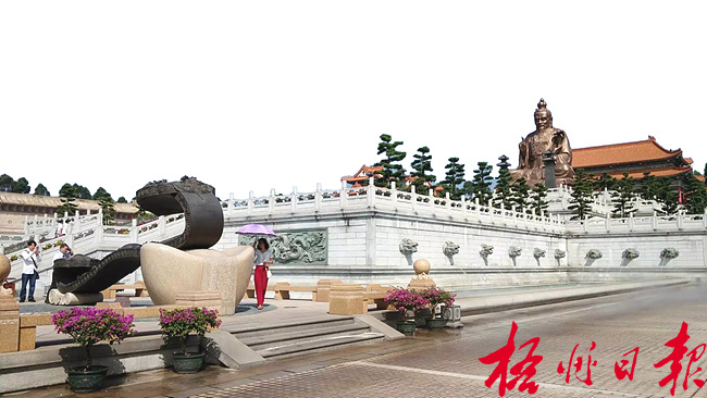 ????我們還參觀了花都頗具規模的“圓玄道觀”。入門后,一座巨型的老子塑像屹立在正前方,他是道教的創始人,著有系列的道家學說,內涵豐富的哲理,一千多年來,為世人推崇研究學習,成為我國的一大教派。觀內有宏偉壯觀的三座寶殿,其中一座專門為呂洞賓而設,這就是世人常說的“無事不登三寶殿”。還有九龍石雕,反映九龍治水的故事。據悉,梧州有一座有一千多年歷史的三清宮,坐落在火山附近,幾十年前被毀,至今未修復,我認為可以借鑒廣東的做法,歷史不應中斷。