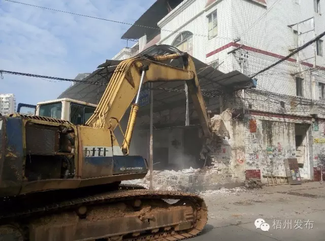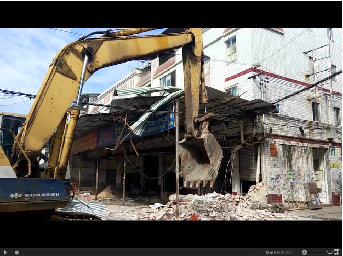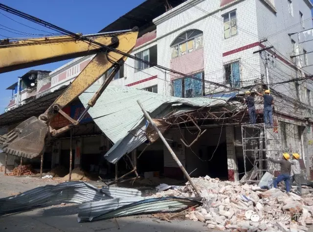 ????鉤機將商鋪自建的磚墻推翻。