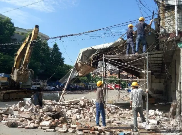 ????遮雨棚被鉤機慢慢拆下。