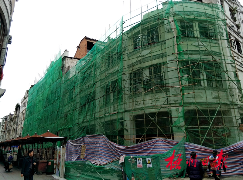 ??? 11月11日,在騎樓城居仁路,幾棟舊宅已經圍起安全網實施改造。