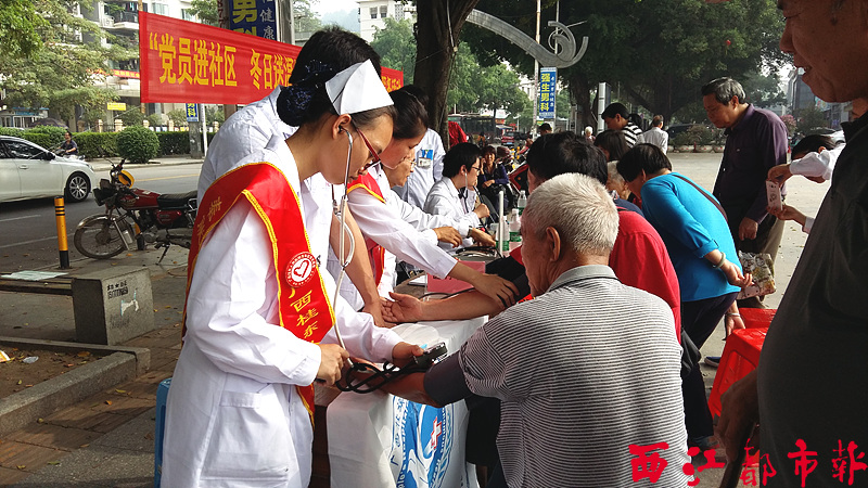 ????11月19日上午,云龍社區聯合桂東人民醫院、梧州職業學院等“雙報到”單位,在鴛江麗港廣場開展黨員進社區集中服務活動,為轄區居民群眾提供醫療保健、手機貼膜、自行車摩托車維修等服務。記者 朱元冬 通訊員 黃秋妮 攝影報道
