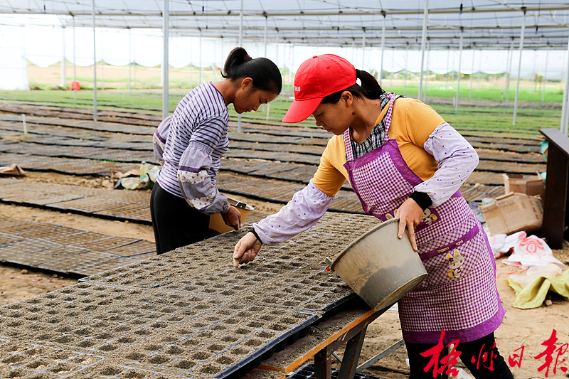 ????11月19日, 在萬秀區(qū)思良江休閑農(nóng)業(yè)(核心)示范區(qū)花卉育苗中心,夏郢鎮(zhèn)答涓村村民把花卉種子投放到育苗盤中。 陳可夫 攝