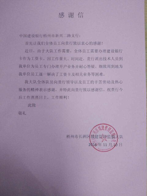 11月15日下午,建行梧州分行轄屬新興二路支行收到一封來自梧州市長洲區城建管理監察大隊的熱情洋溢的感謝信,信中對新興二路支行員工在對其單位上門發卡過程中不辭辛勞,工作認真細致,服務專業的精神表示衷心的感謝和高度的贊賞!