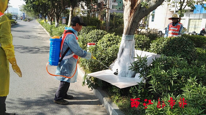????據梧州市園林綠化工程處維護科負責人莫先生介紹,噴霧器里面裝的是涂白材料,含乳膠、生石灰、石硫劑等成分,這些材料既能幫助樹木防寒抗凍,也能防治病蟲害。“在樹干1米處用厚塑料膜圍纏的目的是確保噴漆的高度規范,在涂白過程中使得頂端的線條整齊一致。”莫先生說,為了避免在涂白過程中涂白材料飛濺到其他植物和行人、車輛之上,園林綠化部門在往年實踐的基礎上,今年總結出了一套新的涂白方法。在噴灑有色塊的路樹時,工人先用木板隔開色塊,而在噴灑單株路樹時,工人就用編織袋作適當遮擋,以免涂白材料飛濺。此外,從去年開始,園林綠化部門改用電動噴涂的方式噴灑涂白材料,相較于手動涂刷,電動噴涂速度更快、更均勻,也節省了不少人力。