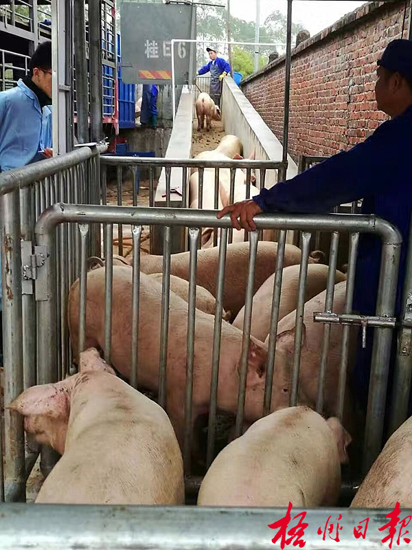 ????蒼梧縣石橋鎮培中村生豬優化養殖場是當地產業扶貧示范點,主要收購生豬進行優化養殖,經檢驗合格后銷往香港市場。目前,該農場存欄生豬3000多頭,每天都有生豬出欄。圖為生豬正在出欄,準備銷往香港。 黎曉婷 梁萍 攝
