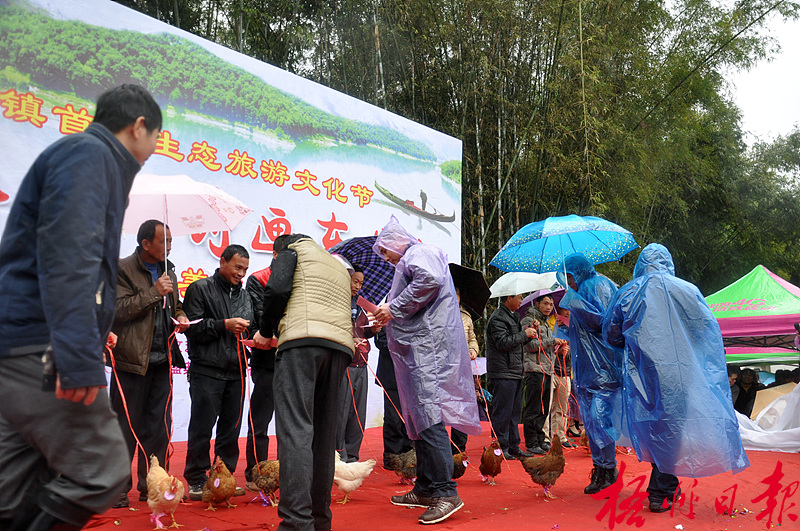 ????活動中,最引人注目的項目絕對要算金雞比美了。金雞比美大賽分公雞、騸雞、項雞三組進行。首先上場的是20多只雄赳赳、氣昂昂的大公雞,它們在主人的帶領下迎著雨水昂首挺胸步入賽場,站在舞臺上毫不膽怯,或展翅飛翔,或左顧右盼,或金雞獨立……形態各異,各展風姿。經過6名專業評委的細心觀察,認真比對,最后一致評選體形肥壯,毛色鮮艷,特具靈性的1號為冠軍。緊接著,經過近半個小時的激烈的角逐,氣宇軒昂的騸雞組和體態嬌小的項雞組也評出了實至名歸的冠軍。手捧金燦燦的金雞獎杯和活生生的活雞苗獎品,獲獎冠軍的主人樂開了懷。