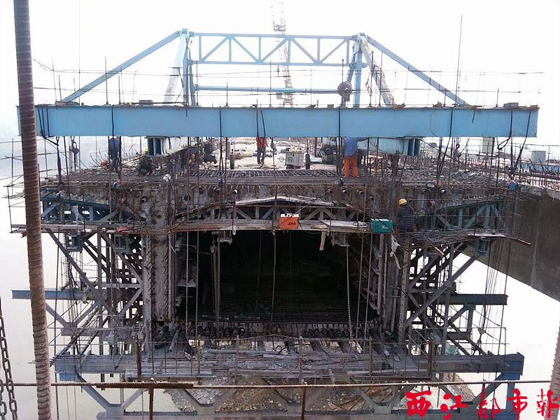 ????在西江三橋主河橋的施工現場,部分施工人員正在高出水面40多米的平臺焊接鋼筋和搬運物料。據施工單位中鐵十八局西江三橋工程項目部工程部部長高飛介紹,西江三橋分左右兩幅各88個梁段,在橋墩墩身建設完成后,自2015年10月開始進行梁段的“掛籃”施工,目前,右幅梁段“掛籃”施工已經完成,左幅梁段還剩6個。