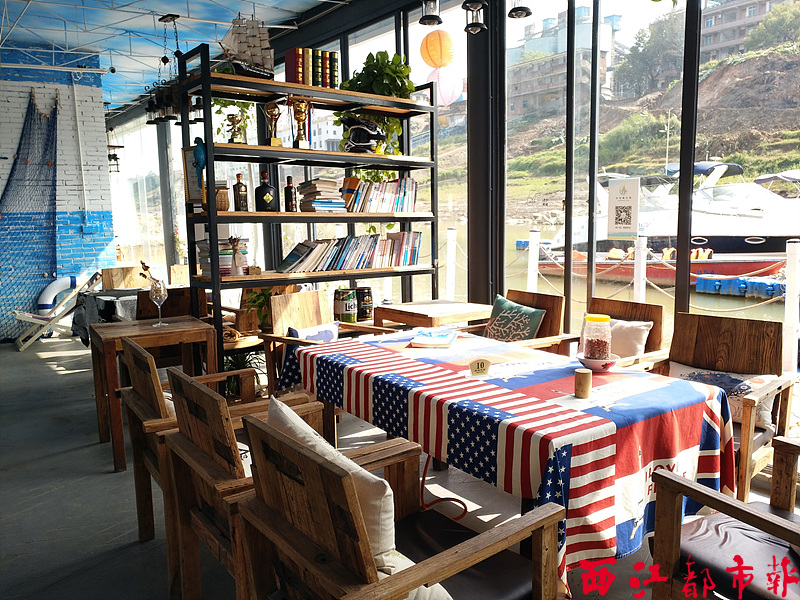 ????透明的落地窗戶,用畫布做成的藍天白云天花板,擺放了書本、綠色植物的架子,藍白相間的墻上掛著船錨、船舵、漁網、帆船,幾盞復古吊燈,一棵掛著瓶子和照片的樹干……餐廳內各種擺件裝飾充滿浪漫的地中海風情。這不是遠在歐洲地中海的某一家餐館,而是梧州西江水域上的一個特色西餐廳。餐廳設在船舶上,浪漫而溫情,更添幾分飄逸和自由。