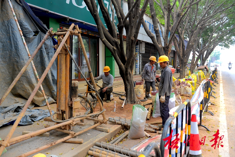 ??? 12月12日,在西堤一路,工人正在路上鉆孔安裝灌漿導管。