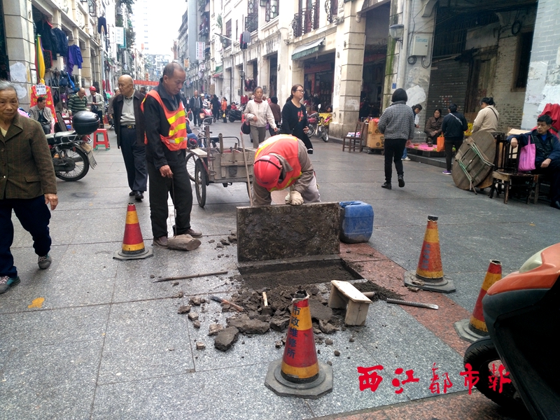 ????只要不下雨,施工人員每天都在外面做路面修復工作,三輪車、水泥、鐵鏟、木塊成了他們的“標配”,他們一邊修復一邊巡查哪里有爛路。上一周,他們已經修復了西江一路、中山路、大南路、南環路等,完成大東下路的修復后,他們將繼續到阜民路、西江三路工作。