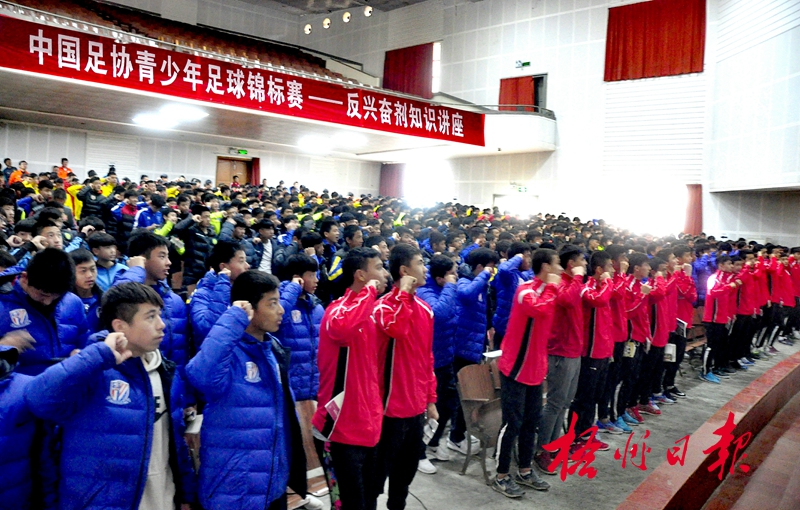 ??? 12月12日,由中國足協主辦的反興奮劑知識講座在蒼梧縣人民會堂舉行,在梧州體訓基地備戰U16全國錦標賽的700多名運動員宣誓,自覺遵守反興奮劑的有關規定,認真履行反興奮劑責任。