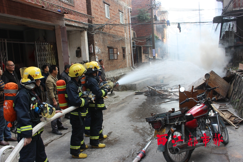 龍山路一廢舊家具堆起火,消防官兵用水槍進行滅火。