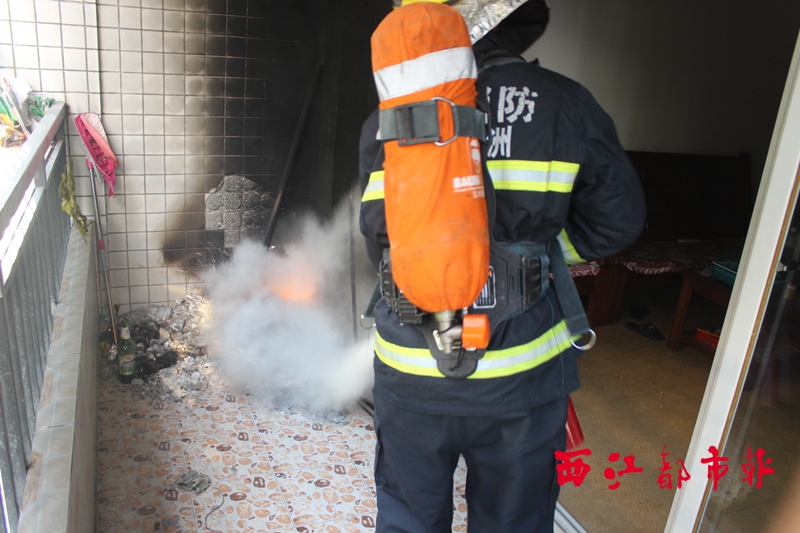 西環路銀山華庭一住戶陽臺起火,消防官兵用干粉滅火器滅火。 (圖片均由消防部門提供)