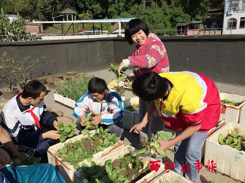 學(xué)生們?cè)趯W(xué)校樓頂?shù)男〔藞@里體驗(yàn)種植課。(梧州市特殊教育學(xué)校供圖)