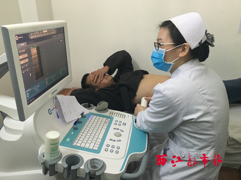 ?1月4日,醫(yī)務(wù)人員正在使用影像引導(dǎo)無(wú)創(chuàng)肝纖維化診斷系統(tǒng)為患者進(jìn)行肝臟檢查。 李玉瑩 /攝