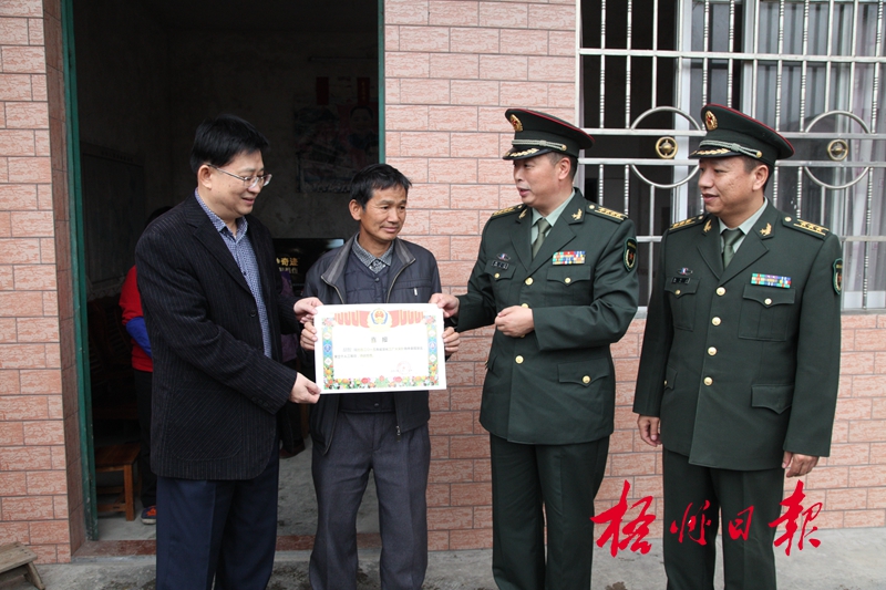 ??? 1月11日上午,梧州軍分區參謀長周立品看望慰問軍屬胡在吾一家,并把立功喜報、獎勵金和慰問金轉交胡在吾。 陳小泉 攝
