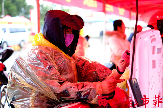 ????受冷空氣影響,當天,梧州市出現(xiàn)了持續(xù)陰雨天氣,氣溫低至10℃左右。記者身穿羽絨服在戶外采訪時,仍然能夠感受到陣陣寒意,但寒風(fēng)冷雨未能阻擋“摩托大軍”回家的腳步。早上10時過后,雨勢加大,一批批“摩托大軍”陸續(xù)進入東出口春運服務(wù)站休息。