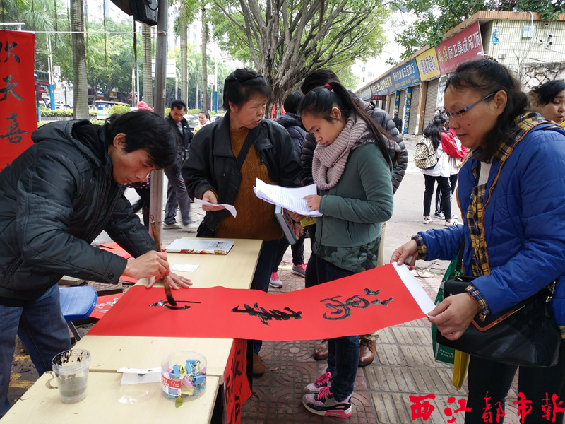 1月14日,黨員義工為市民提供寫春聯服務。當日上午,梧州市上千名黨員義工分別在梧州市鴛江麗港中心廣場、新興二路大塘市場至清華苑路段、市政廣場、龍圩區世紀廣場等地,開展以“黨員義工連萬家,為民服務當先鋒”為主題的2017年春節黨員義工集中為民服務活動。記者??蒙敏瑩??攝