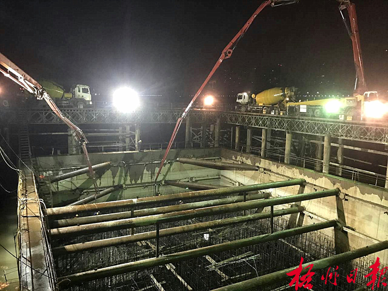 1月12日晚,西江四橋12號主墩施工現(xiàn)場燈火通明,兩臺泵車正在對12號主墩進行第二層承臺砼澆筑,幾十名工人冒著寒風冷雨加緊施工。