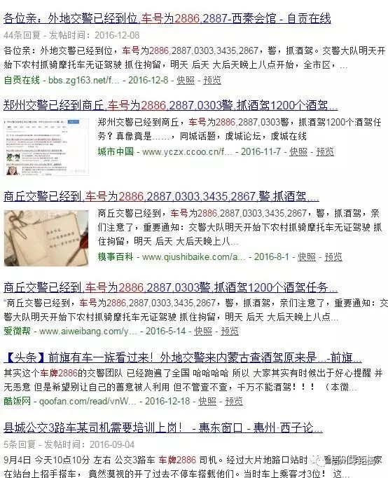 ????再度娘一下就能真相大白了,各地信息內(nèi)容都如出一轍,僅僅換個地名而已,車牌號也都是A2886警,2887警,0303警……(拜托,傳謠者可唔可以冇咁hea)
