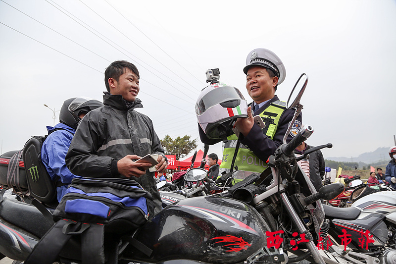 ????1月16日上午,在國道321線藤縣陶瓷園區(qū)春運服務站,交警用紙巾為駕車返鄉(xiāng)的摩托車司機擦拭安裝在頭盔上的行車記錄儀上的灰塵,并叮囑司機守法行駛。
