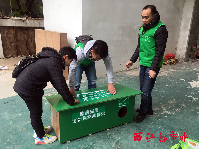 1月17日,愛心人士在灝景尚都小區(qū)組裝流浪貓屋。西江都市報記者 謝韻 攝