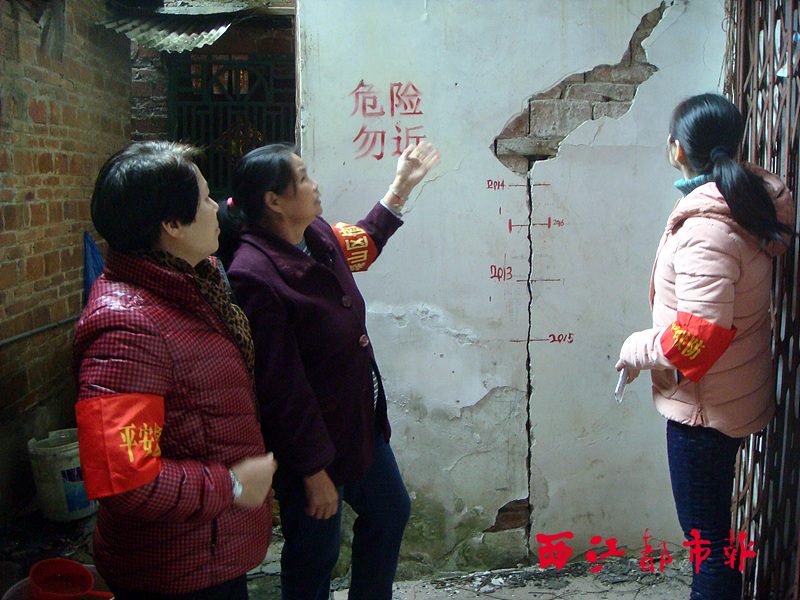 ????2013年8月連續(xù)不斷的一場暴雨,讓蝶彩里五級和六級共26棟房屋分別出現(xiàn)下沉、開裂、傾斜、位移等險情。隨后,城區(qū)政府、東興街道辦事處、蝶彩社區(qū)等政府部門當(dāng)即對26戶居民進行緊急撤離,并給予一定的補貼安置。而這26棟危房所在地就成為當(dāng)?shù)匾粋€地災(zāi)點,蝶彩社區(qū)召集附近未受影響的居民成立了地災(zāi)巡查組,每天24小時輪流巡查和監(jiān)測,一旦發(fā)現(xiàn)房屋或地面裂縫變大、繼續(xù)位移和下沉等險情,就立即向社區(qū)報告。