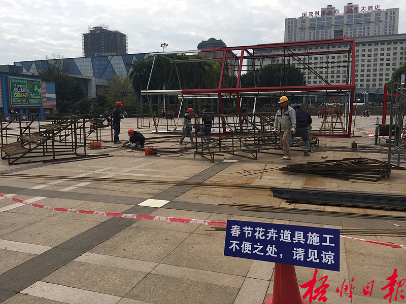 1月20日,在市政廣場,工人們正焊接搭建花卉造型鋼筋支架。梁萍 攝