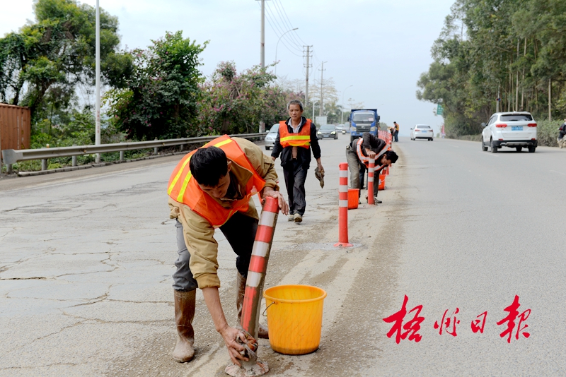 ?連日來,市市政、交通部門對梧封一級路沿路的交通標志桿、標識牌等進行清洗,保障春運期間道路交通安全。 李鴻榮 攝