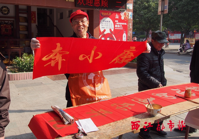 ??? 1月25日,今年65歲的原航運(yùn)公司退休職工陸中識(shí),在新興一路潘塘公園附近為市民揮毫灑墨寫春聯(lián)。據(jù)陸中識(shí)介紹,他年輕時(shí)就愛好書法,經(jīng)常幫親朋好友寫春聯(lián)。每年春節(jié)前,他都會(huì)上街為市民寫春聯(lián),用自己的書法技藝賺點(diǎn)零花錢。