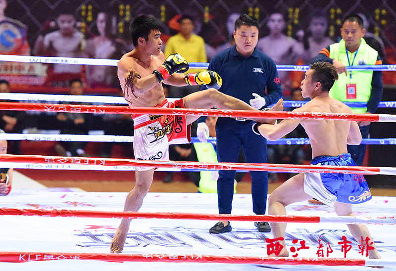在岑溪市文體中心,選手在“昆侖決”拳王爭霸賽中出招。通訊員 胡紅 攝