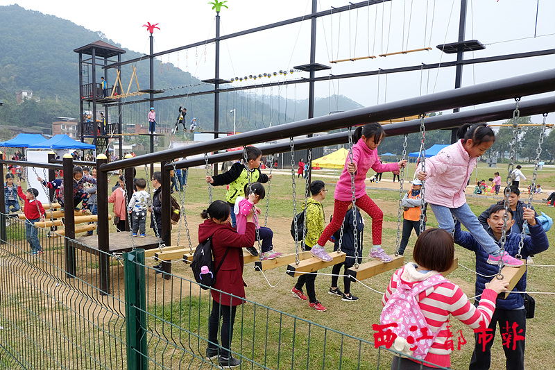 ????春節期間,試營業的梧州軍博園人氣旺盛,不少市民帶著小朋友入園參與戶外拓展游戲。西江都市報記者 何鎏 攝