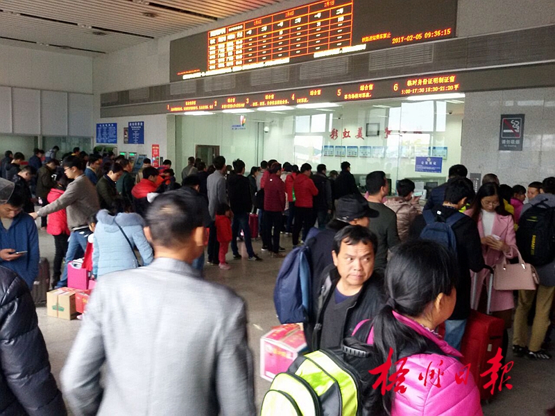 ??? 2月5日,在梧州南站售票大廳,旅客排隊等候買票。據觀察,節后回務工地的“摩托大軍”雖然相對分散,但流量仍然較大。與此同時,梧州南站、金暉汽車站等市區鐵路公路客運站點連日來也是人頭攢動,節后返程車流人流高峰持續。 李煜榮 攝