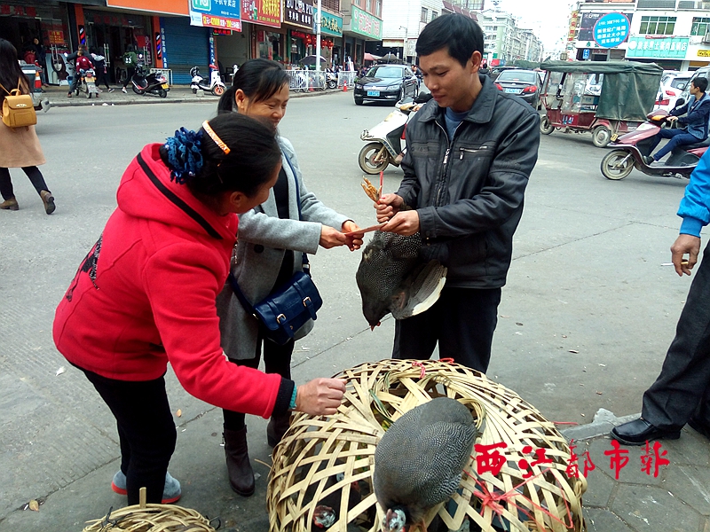 曾春升(右一)在集市上出售珍珠雞。(曾春升提供)