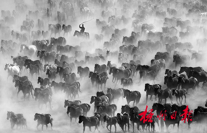 ????2013年國慶期間,歐偉文到甘肅創作。一天下午,歐偉文在山丹軍馬場的一個山頭上守候馬群經過。接近下午四時,幾百匹馬從山坡前以排山倒海之勢奔跑而過,氣勢磅礴,場面震撼。加上當地天氣長時間的無雨,地面干燥,群馬跑過之處塵土飛揚,使場面虛實變幻,幾個趕馬人時而隱沒在塵土中,時而突現在馬背上。歐偉文用佳能5DⅡ配70至300長焦鏡頭居高臨下,不停地狂拍。他將圖片處理成黑白效果,保留了豐富的影調和層次,呈現水墨畫的效果。《萬馬奔騰》在國際攝影大賽和國內攝影大賽中先后獲金獎、銀獎、銅獎,榮譽獎、絲帶獎等獎項8次,并獲廣西文藝最高獎--廣西區人民政府文藝創作銅鼓獎。