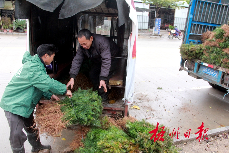 2月8日,在蒙山縣城大教嶺苗木市場,林農(nóng)將剛購買苗木裝車運(yùn)輸。