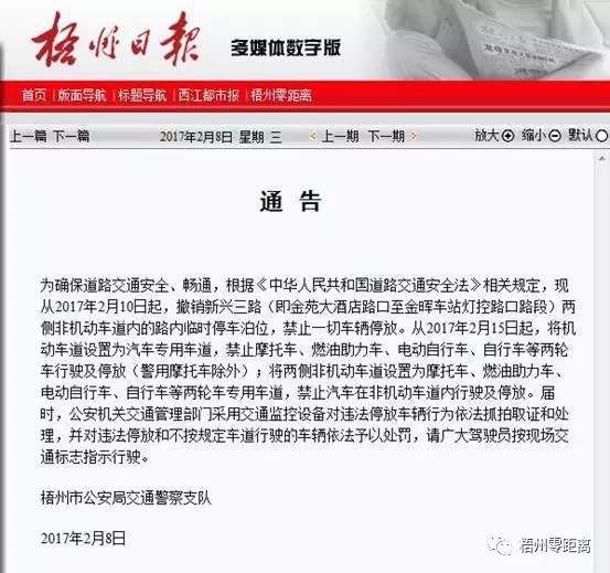 ????通告指出,從2017年2月10日起,撤銷新興三路(即金苑大酒店路口至金暉車站燈控路口路段)兩側非機動車道內的路內臨時停車泊位,禁止一切車輛停放。從2017年2月15日起,將機動車道設置為汽車專用車道,禁止摩托車、燃油助力車、電動自行車、自行車等兩輪車行駛及停放(警用摩托車除外);將兩側非機動車道設置為摩托車燃油助力車、電動自行車、自行車等兩輪車專用車道,禁止汽車在非機動車道內行駛及停放。屆時,有關部門將采用交通監控設備對違法停放車輛行為依法抓拍取證和處理,并對違法停放和不按規定車道行駛的車輛依法予以處罰。