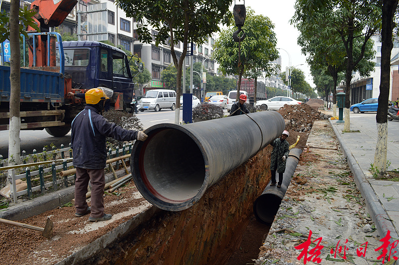????2月10日,在蒙山縣城湄江南路,施工隊正鋪設供水管道。