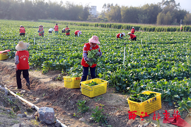 ????2月15日 ,群眾在蒙山縣文圩鎮的宇遠生態農業示范區,采收富硒蔬菜菜心。
