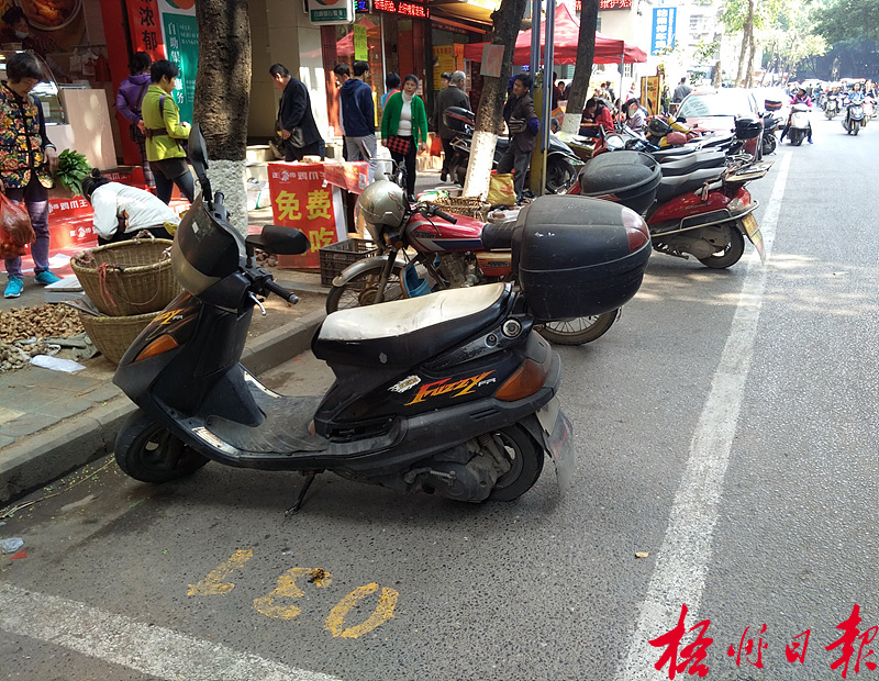????2月16日,在蝶山一路,一些摩托車停放在收費的小車停車位。