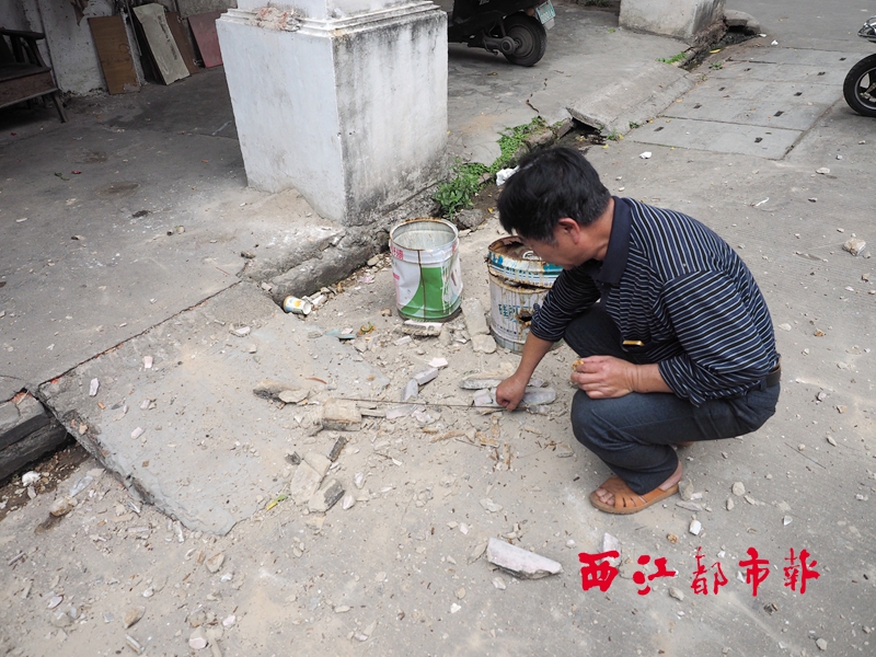 ?2月19日,民主社區四坊路8號的騎樓城外墻灰雕突然脫落墜地,砸壞了停放在附近的三輛摩托車,灰砂、鐵條灑落滿地,幸好沒有傷及住戶和行人。