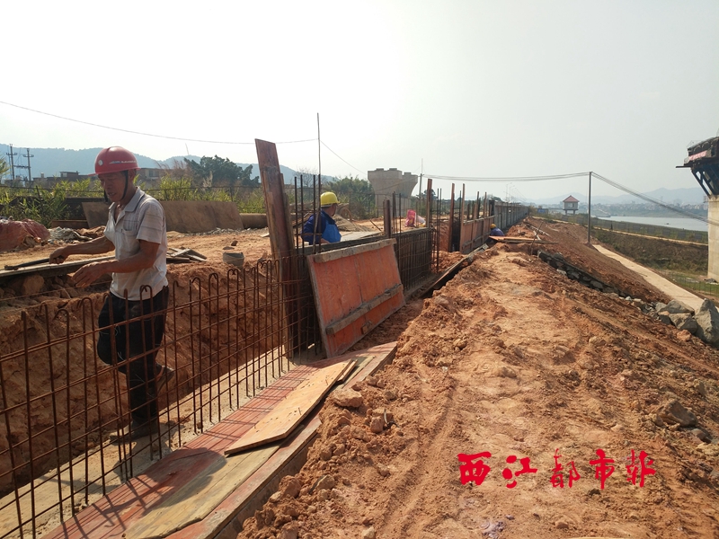 施工人員利用建筑模板為將要澆筑混凝土的防洪墻定型。西江都市報記者 蒙敏瑩 攝