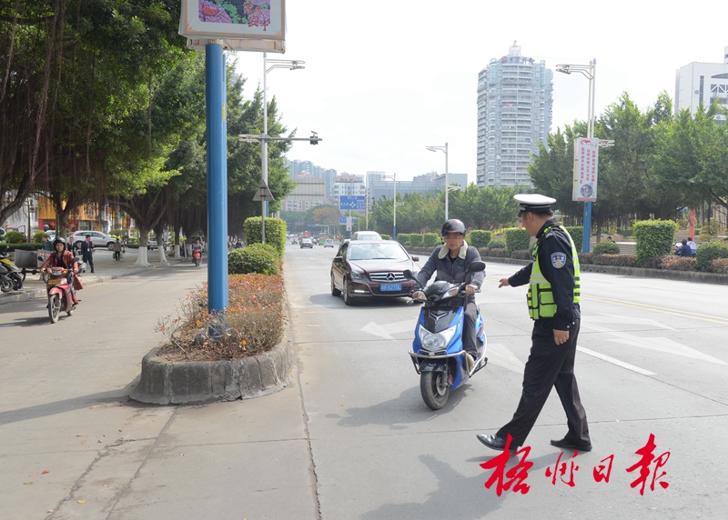 ??? 2月21日,在新興三路,民警正在攔截在機動車道行駛的助力車。