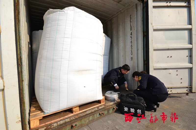 ????2月20日上午,李家莊碼頭,梧州出入境檢驗檢疫局動植物檢疫科工作人員黎琦和高天妮,正在開箱查驗一個剛到港的集裝箱。