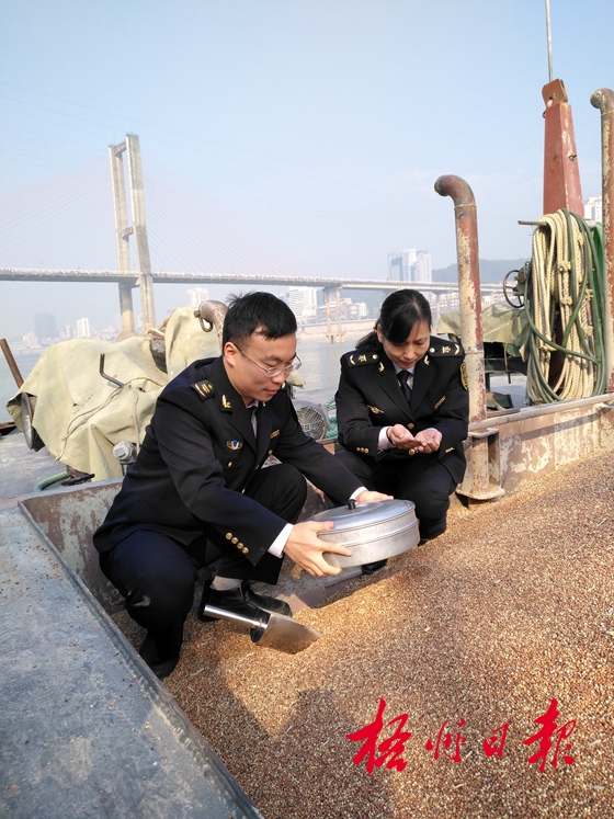 ????碼頭上,長120米的糧食傳送帶伸到江邊,旁邊有一道寬不足0.5米的鋼制小梯,由于坡度大,人走在上面十分費勁,還要格外小心。梧州檢驗檢疫局動植檢驗檢疫科副科長李小青說:“這批高粱約有一噸,用于飼料加工。”目前,梧州口岸有李家莊碼頭、中儲糧碼頭、赤水碼頭和蒙江鎮木司碼頭可以承接糧食進出口運輸業務,其中進口糧食主要來自美國、阿根廷、烏克蘭、法國等國家,包括大麥、玉米、高粱等,主要用于糧食加工。