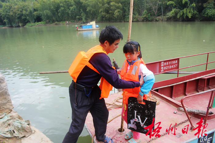 ????“我得走了,晚了怕孩子著急。”2月22日,早上7時30分,青菜還沒炒好端上桌,岑溪市波塘鎮楊亦小學的老師倪華成就匆匆扒了幾口粥,穿上救生衣后告別老伴,腳步匆匆趕到黃華河渡口碼頭處,一個人耐心地等待村子里新學期唯一一名需過河上學的四年級學生倪宇雁。身穿救生衣的倪宇雁來到了,他便踏上停靠在渡口處的一艘鐵船,輕輕一劃船,腰身微微一彎用勁,船便離開岸,蕩向對面行去……