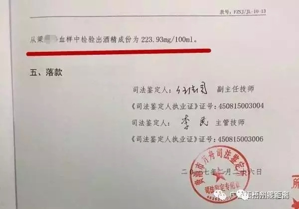 ????為了獲取證據,警方將肇事者梁某某帶到醫院抽取血樣,經貴港市方舟司法鑒定所作血液酒精含量檢查。檢查報告顯示:肇事者每百毫升血液酒精含量達223.93毫克,是醉駕標準的將近三倍!(每百毫升血液酒精含量達20毫克為酒駕,達80毫克為醉駕)