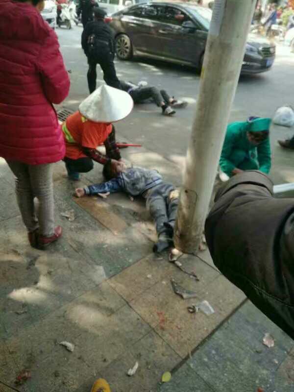 ????劉石蘭是萬秀區環衛站西江二組的一名環衛工人,與同事一起負責西江二路、三路和石鼓沖一帶的保潔工作。2月26日14時50分左右,劉石蘭正好在西江三路鴛江麗港廣場附近清掃垃圾。聽到突如其來一聲“嘭”的巨響后,她一扭過頭,就看到了不遠處的大廈公交站周邊已躺著幾個路人,一輛小汽車撞到燈柱上,車頭已嚴重變形。