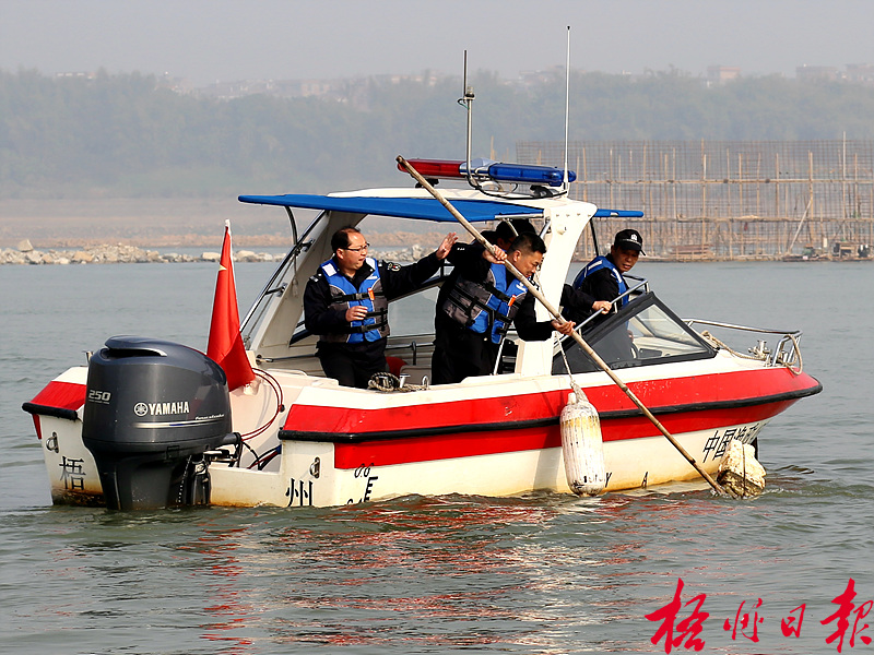 ????3月2日,市農業行政綜合執法支隊漁政執法大隊的隊員在長洲水利樞紐壩下水域清理漁民廢棄的漁具。 陳可夫 攝